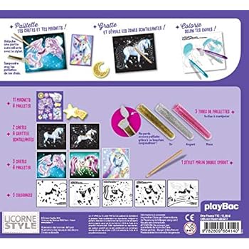 Ce coffret contient : 11 magnets à pailleter, 2 cartes à gratter, 3 cartes à pailleter et 5 coloriages. Il comprend également 3 tubes de paillettes faciles à manipuler et un pic malin à double embout pour détacher les zones à pailleter, et pour gratter finement ou largement les cartes scintillantes.